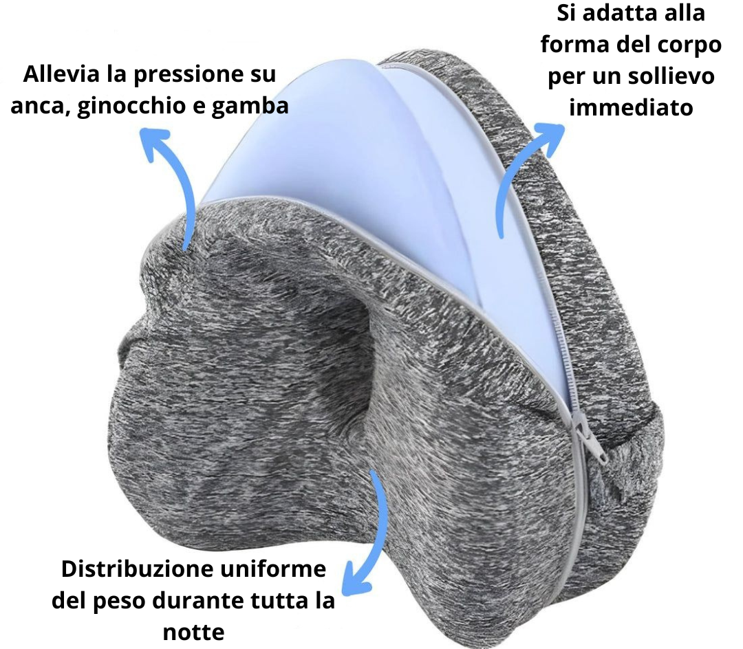 Separando le ginocchia e mantenendo le anche in una posizione neutra, il cuscino riduce la pressione e la tensione nella parte bassa della schiena. Aiuta molti che dormono di lato a riposare in modo più comodo e senza dolore.